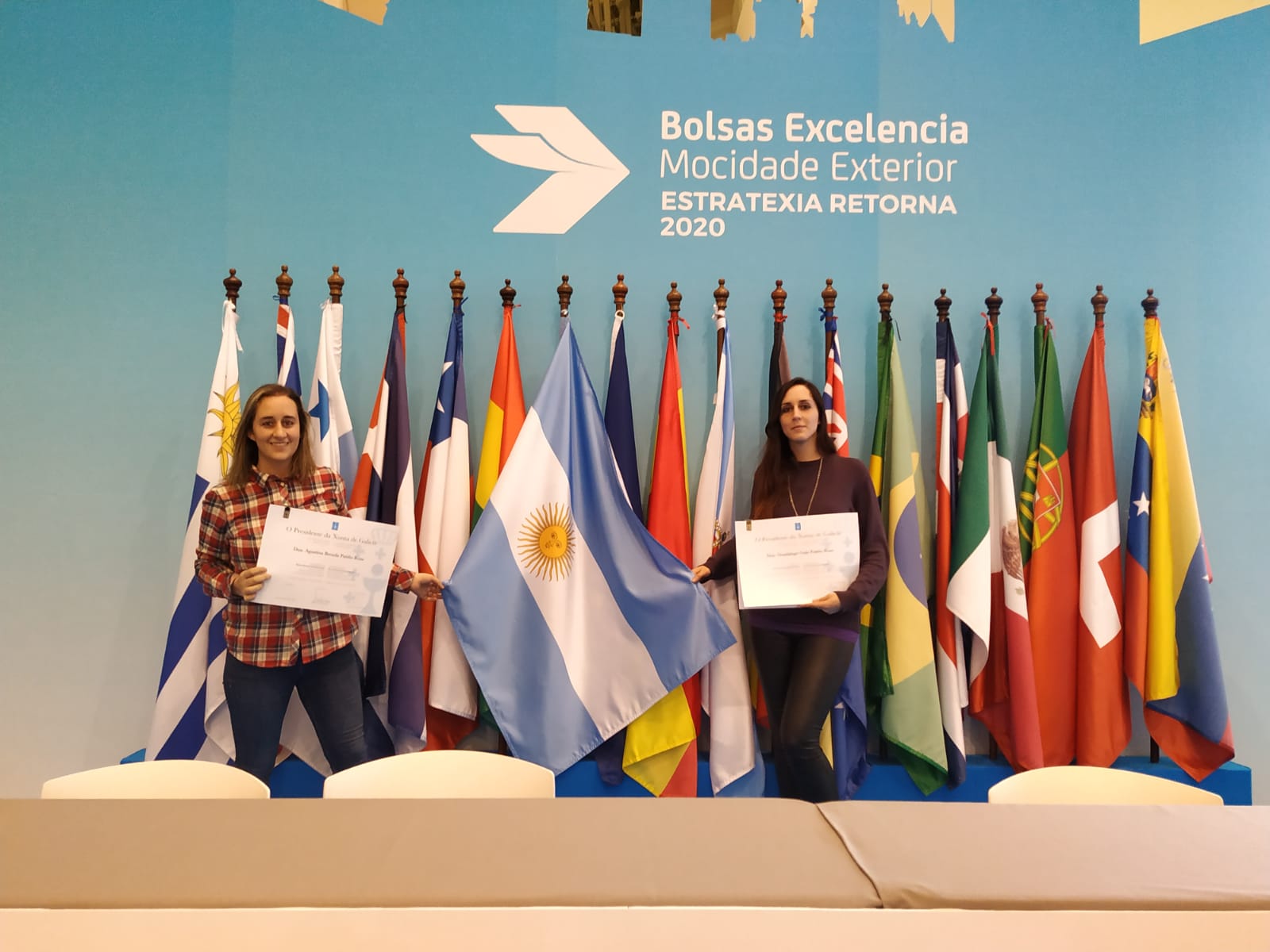 Gala Patiño camina tranquila por la facultad de Derecho de la Universidad de Santiago de Compostela. Es un lunes cualquiera del mes de febrero. Fuera luce el sol y el mundo aún está lejos de cambiar. Dentro, en el salón de actos, comienza una jornada para los beneficiarios de las BEME –acrónimo en gallego de Bolsas de Excelencia Mocidade Exterior-, una iniciativa que cada año promueve el gobierno autonómico para que aquellos gallegos del exterior que lo desean puedan volver a su tierra a cursar estudios de postgrado en alguna de las universidades de la Comunidad.