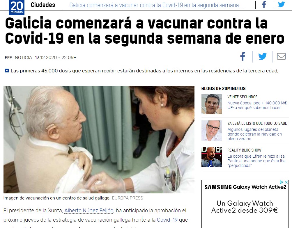 Las primeras 45.000 dosis que esperan recibir estarán destinadas a los internos en las residencias de la tercera edad. 14 Dec 2020 20 minutos https://www.20minutos.es/noticia/4510095/0/galicia-comenzara-vacunar-contra-covid-segunda-semana-enero/ Compartir