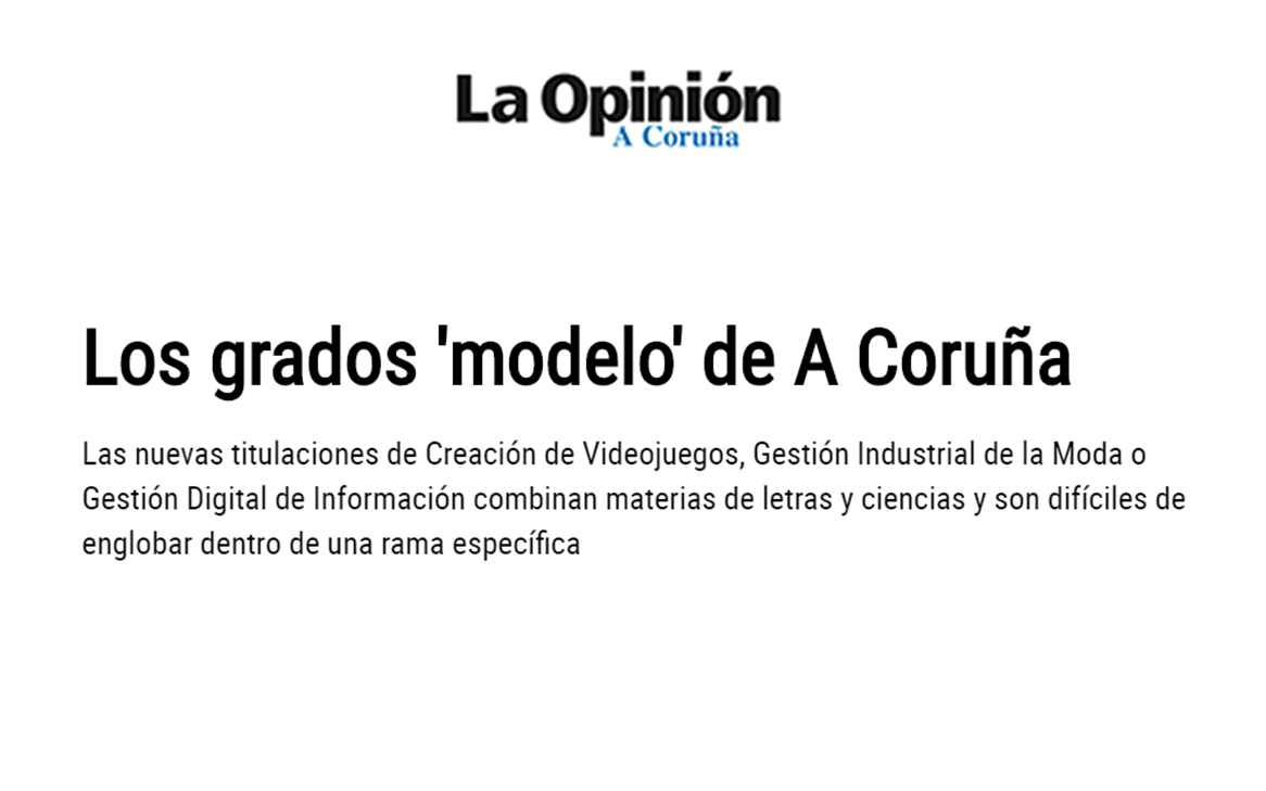 Las nuevas titulaciones de Creación de Videojuegos, Gestión Industrial de la Moda o Gestión Digital de Información combinan materias de letras y ciencias 15 Feb 2020 La Opinión https://www.laopinioncoruna.es/sociedad/2020/02/16/grados-modelo-coruna/1477787.html Compartir