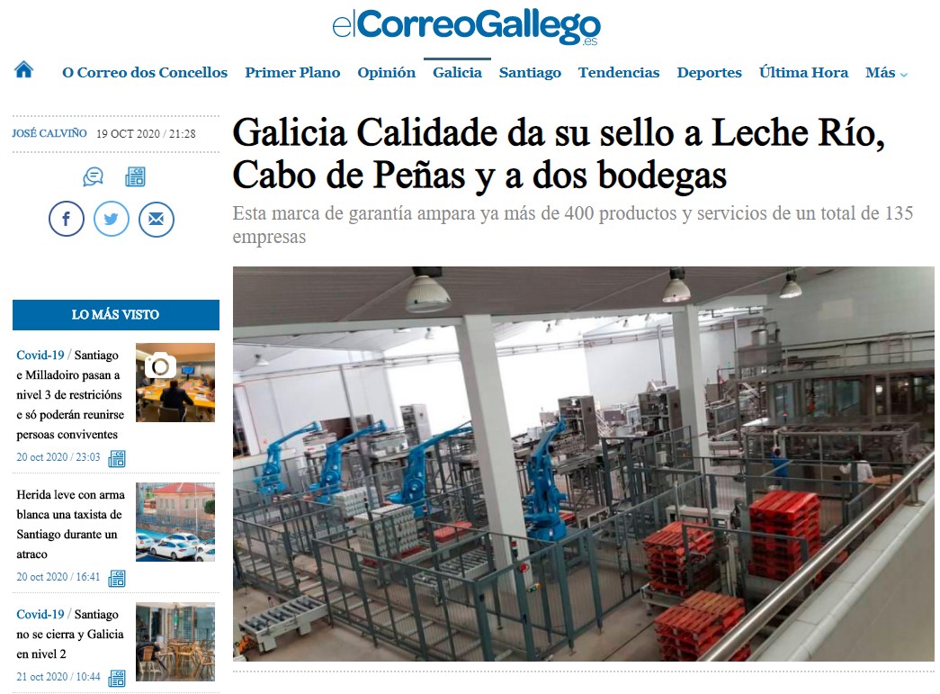 Galicia Calidade da su sello a Leche Río, Cabo de Peñas y a dos bodegas