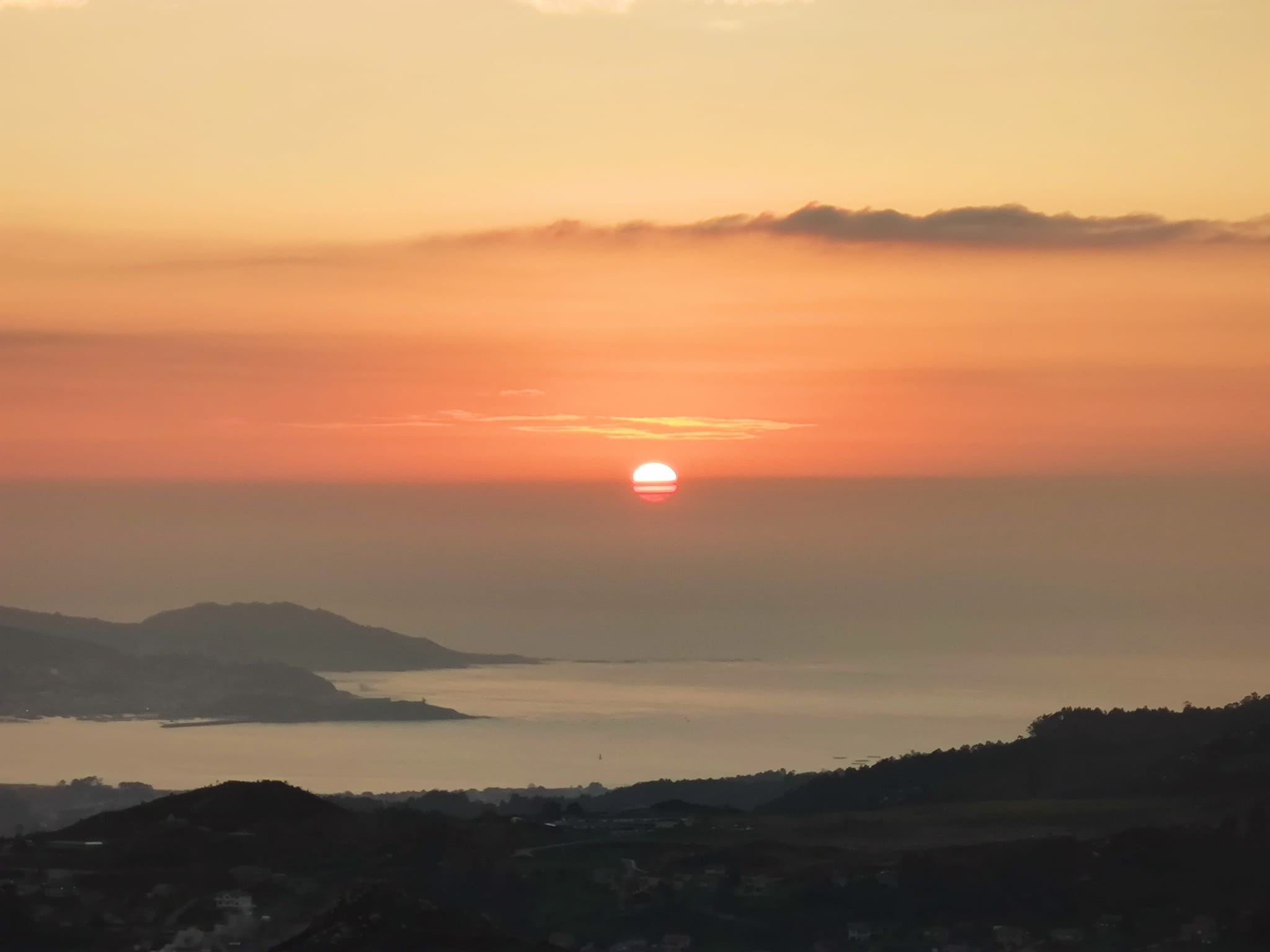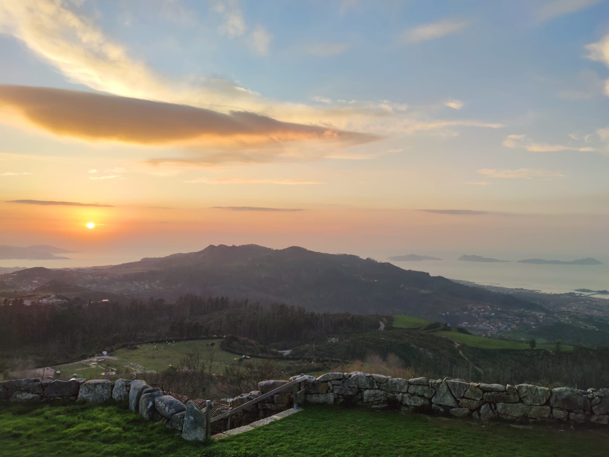 El sol se pone ya ofreciendo una escena perfecta que se eleva desde el azul del mar hacia el gris clarito que dibuja el contorno de las Cíes, flanqueadas -parece casi al lado- por Toralla. Ahora todo es naranja, malva, rojo y amarillo, con el sol, transparente -semeja una bombilla-, partido en dos mientras que entrega el mirador del Monte Alba al silencio de la noche oprimido por el viento que no cesa.